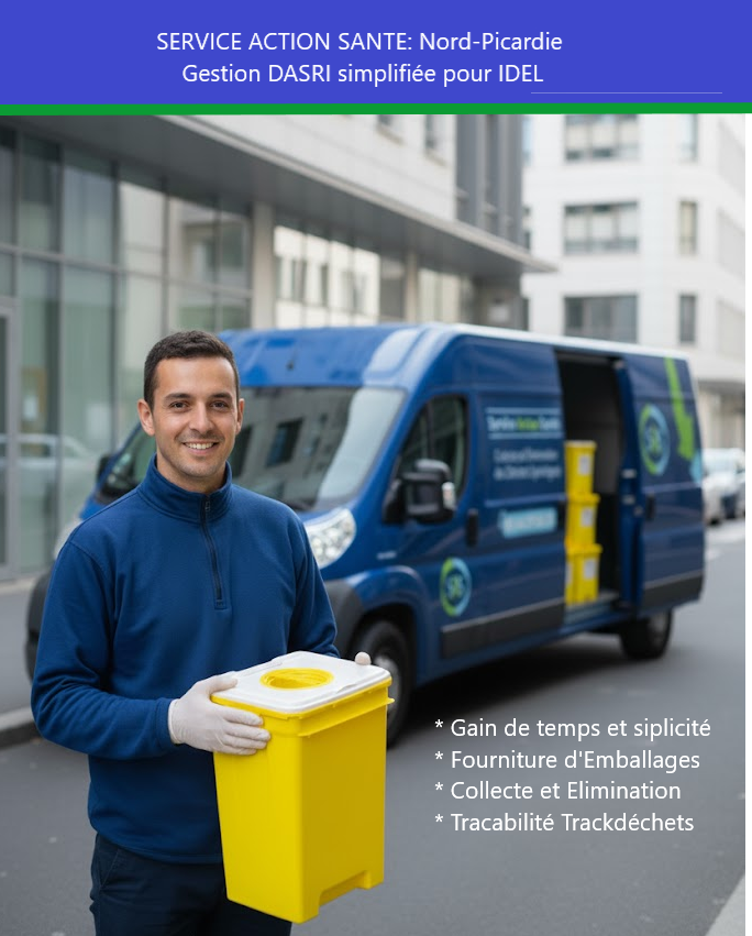 En tant qu'infirmier libéral (IDEL) ou cabinet d’infirmiers, le respect de la réglementation en vigueur pour la collecte et le traitement de vos DASRI (Déchets d’Activités de Soins à Risques Infectieux) est une priorité absolue et une obligation légale. Service Action Santé vous apporte une prestation globale sur mesure, sécurisée et conforme, vous permettant de vous concentrer pleinement sur vos patients.